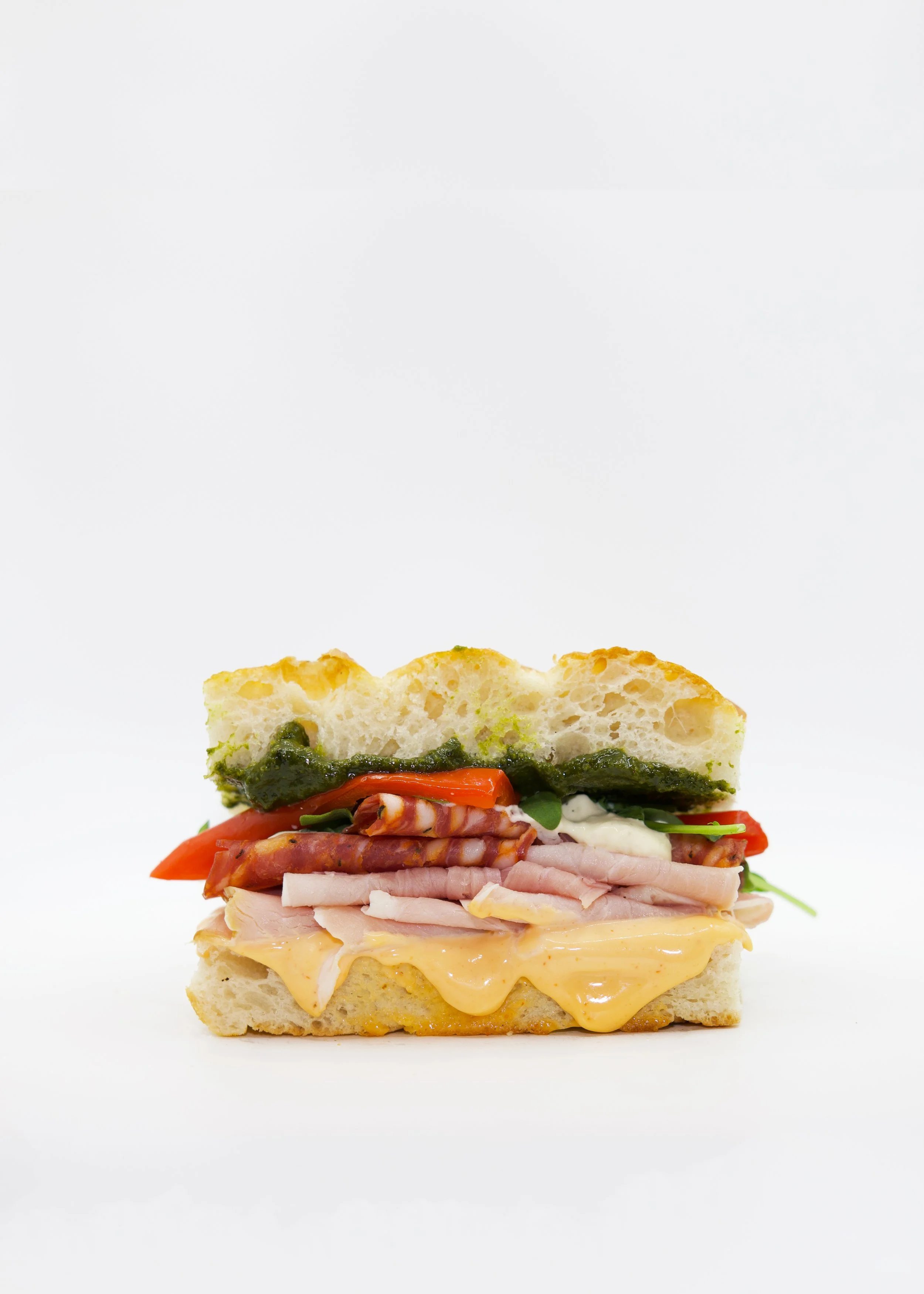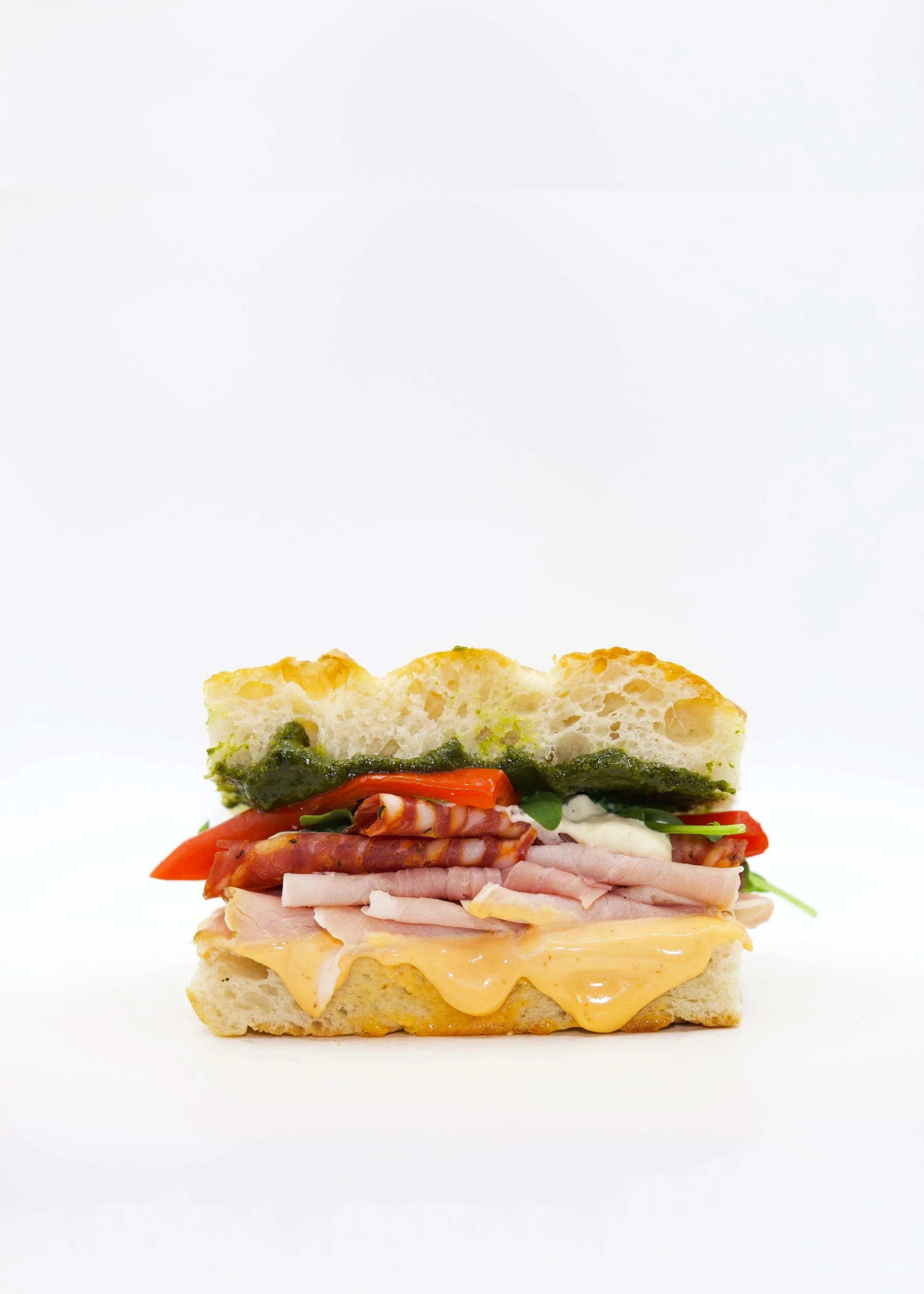 Salami, Leg ham, Fresh Mozzarella Spread, Pickled Capsicum, Arugula & Pesto Sauce